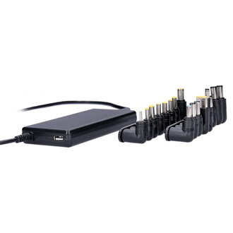 (AD213)Tento univerzálny napájací zdroj s automatickým meničom napätia ponúka výstupné napätie v rozsahu 15-20V a maximálny výkon 90W. Je vybavený 16 vymeniteľnými DC konektormi pre rôzne notebooky a USB-A výstupom na nabíjanie. Zabezpečuje ochranu proti skratu a nadprúdu, s kompaktnými rozmermi a dlhou dĺžkou kábla.